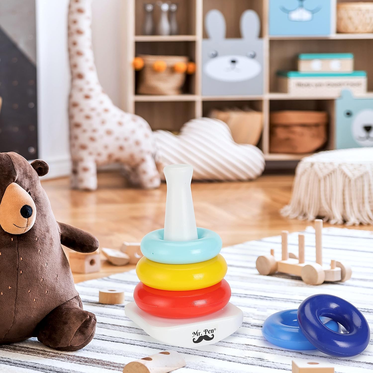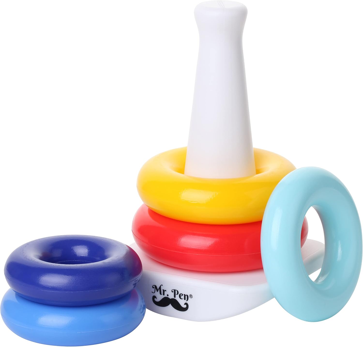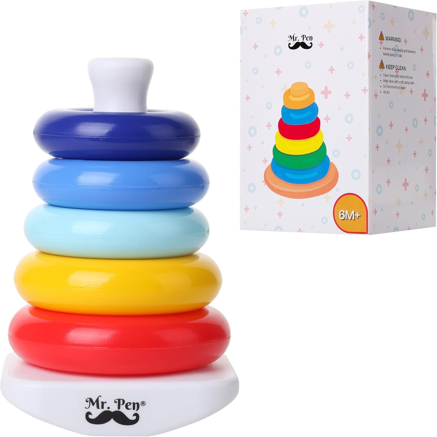 Mr. Pen stacking toy includes 5 colorful rings and a bat-at-rocker base.